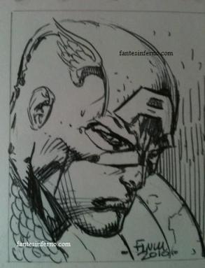 Later in the day I noticed he was drawing a pencil sketch for an attendee. Figuring it couldn’t hurt to ask, I asked if he had opened up a sketch list. He hadn’t, but when he saw my Captain America jam page in progress, he agreed!